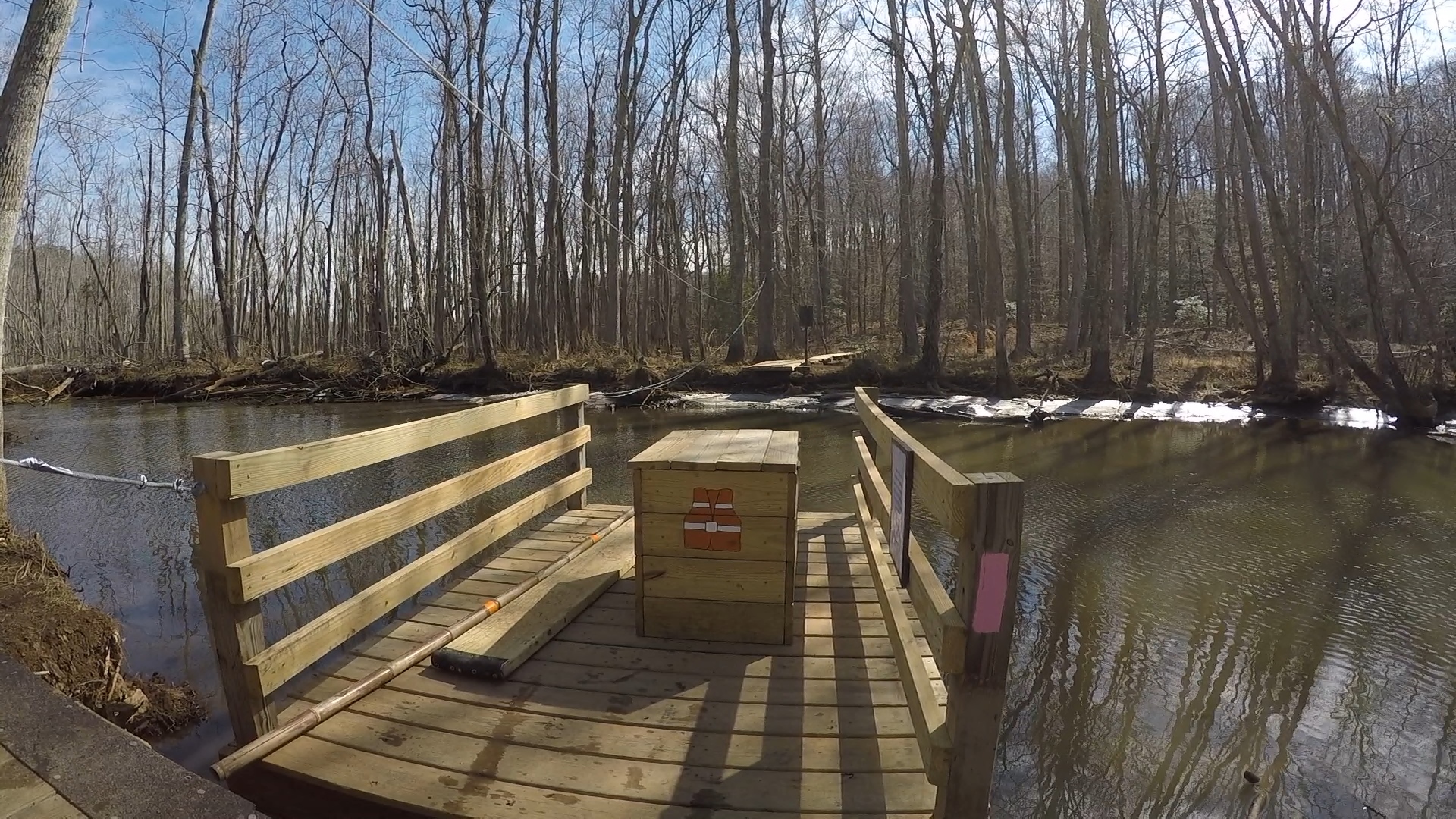 The Raft is cool… a little 5-by-8-foot platform with rails on the sides, a box containing life-vests for those inclined, a bamboo pole, and a 2×10 board to be used as a bridge are all included on the raft, which is connected via plastic-coated cables and pulleys at both banks. When I arrived, a teenager on the opposite shore quickly heaved-to to pull the raft my way… and unfortunately, the raft ran aground a couple feet short of the landing on my side. I couldn’t reach the 2×10 “bridge”, so a little crunching through the sand and ice at the shoreline was required to get to the raft — it appeared the water was lower than normal, so hard to tell if this was typical.