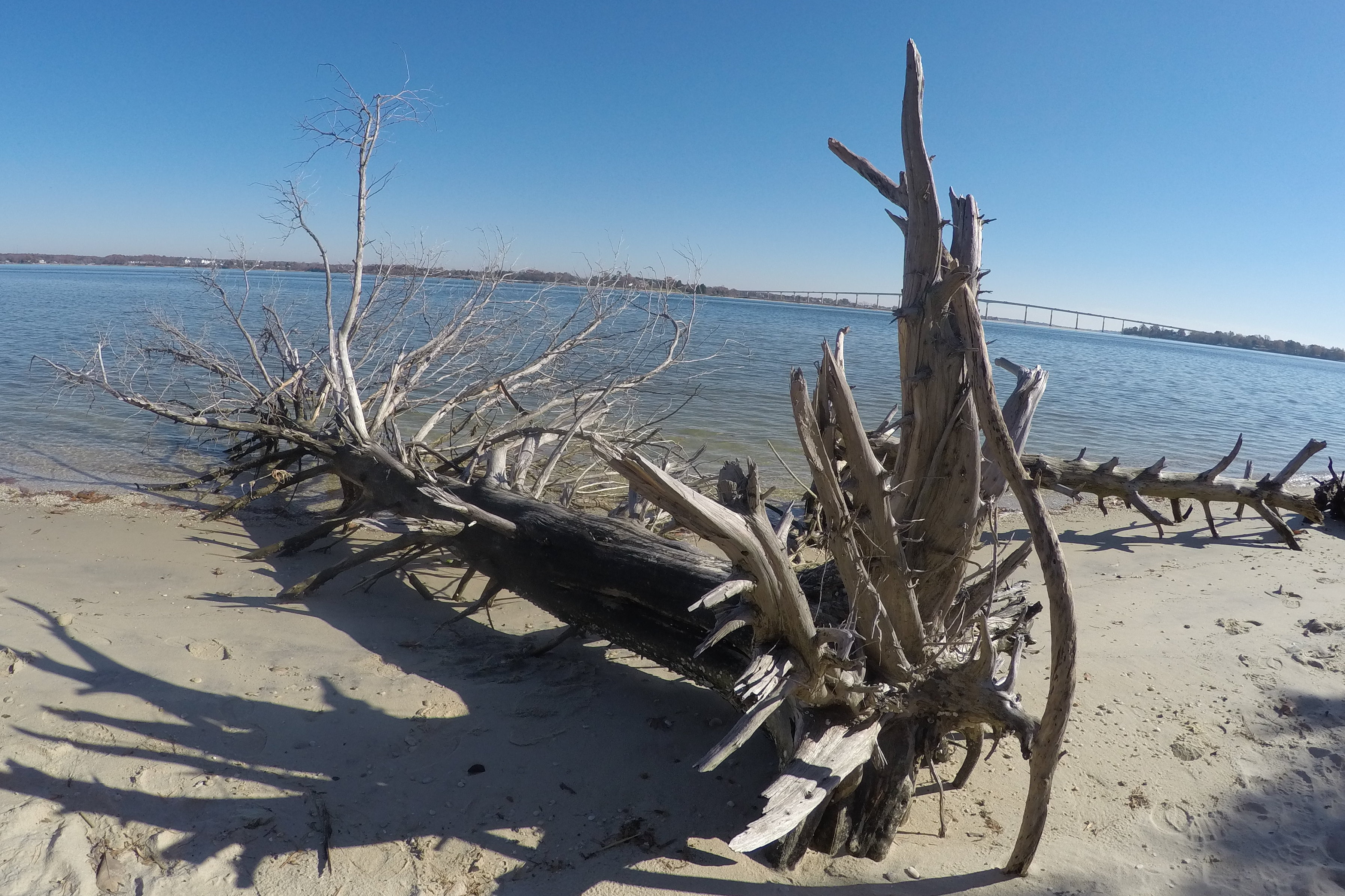 Where water meets land, there is an uneasy truce.   Tides, storms, and the wind-driven waves are constantly altering the shoreline.   It’s not often visible in a given moment, but this tree bears witness.   After years of strong growth, the water undermined its roots, and claimed it.   It is now slowly deteriorating, sinking back into the sea.