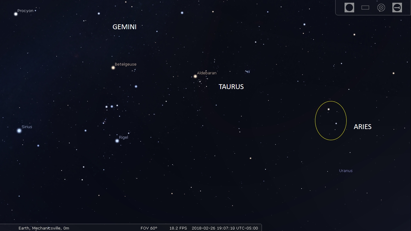 Aries is subtle, just east of more prominent Taurus and Orion. (via Stellarium)