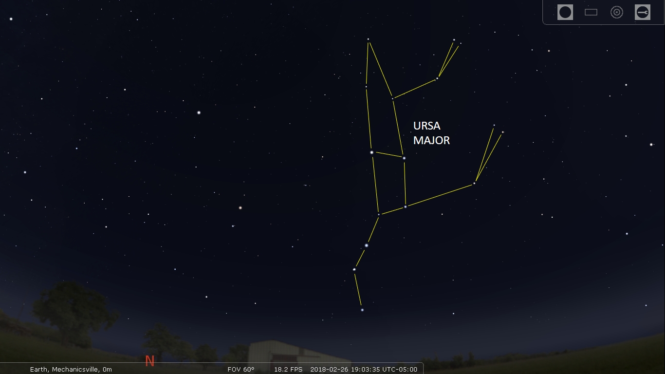 Spring begins with the Great Bear climbing out of his winter den at sunset. (via Stellarium)
