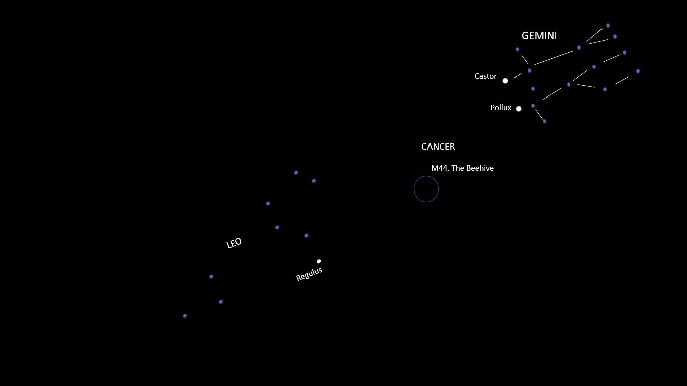 The first: The Beehive, or Messier 44 (M44 for short). This small open cluster is just barely naked-eye visible with averted vision, given the light pollution around my place (which admittedly isn’t horrible). What I mean is, you can see it better when you’re not looking straight at it. It’s in dark Cancer, almost straight up in mid latitudes, halfway between the Sickle of Leo and the heads (Castor and Pollux) of Gemini, and looks like a faint smudge when you look toward either of these neighboring constellations. Pull out the binoculars, and prepare to be dazzled!