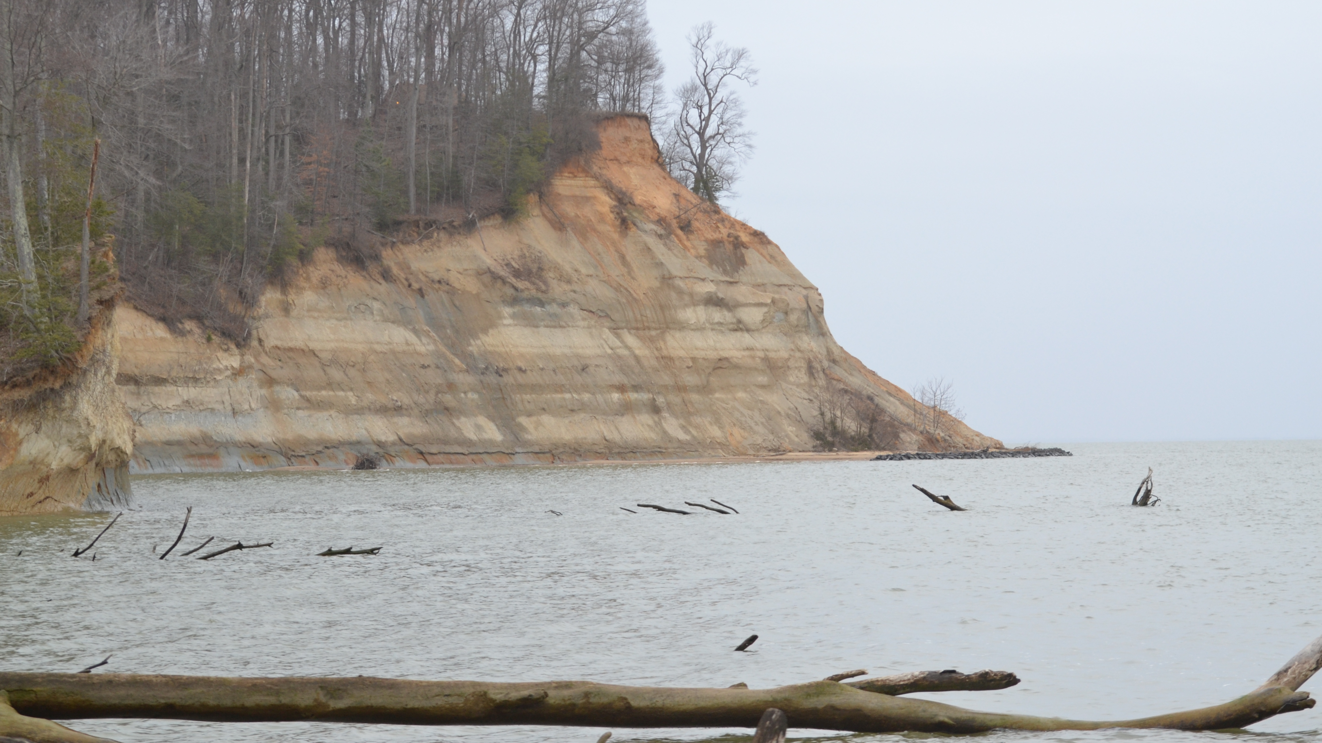 The stripes on these cliffs show different layers of sediment laid down at the bottom of an ancient sea, between 3.5 and 5 million years ago. As the cliffs erode, fossils from that era are released and wash up on the beach.