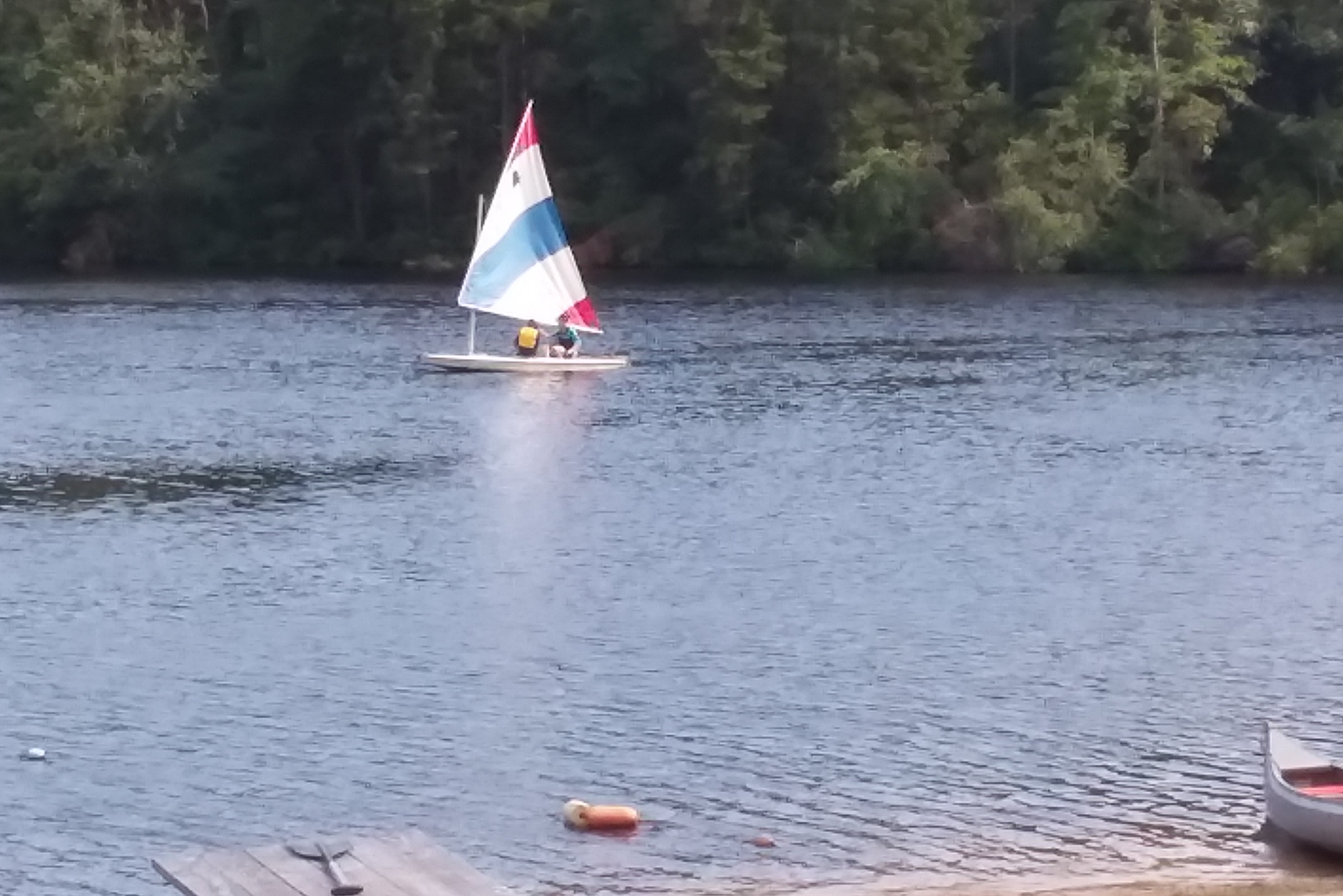 This looks like a regular sunfish sailboat on a regular lake – but it’s sailing on a cranberry bog, or at least the remnants of one. The lake is one of five, separated by small earthen dams, strung together in the Pine Barrens of eastern New Jersey. Cranberries are now long gone, and the lakes turned over to adjacent Boy Scout and Girl Scout camps, teaching sailing, canoeing, and kayaking, among other things.
