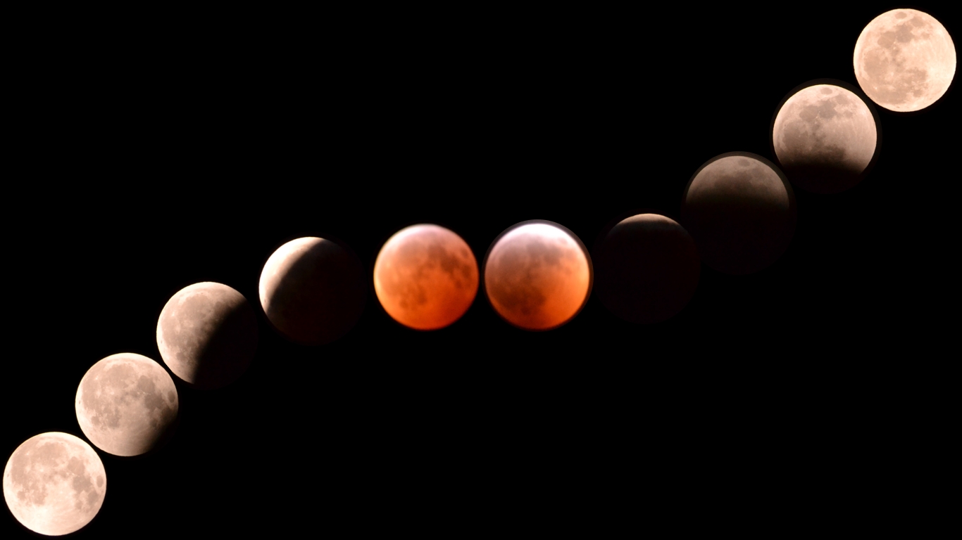 I tried to capture a timelapse of the whole event – that’s being processed and hopefully comes out well.  In the meantime, here’s a montage of the eclipse as viewed from the US East Coast.  Start in the upper right and move left – this is the direction the Moon was moving along its orbit through the Earth’s shadow.  Shots are taken every 20 minutes or so.