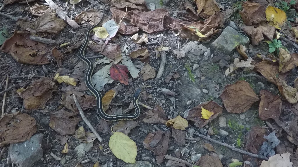 We saw two timber rattlesnakes, and this friendlier garter snake.