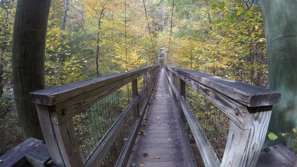 Day 3 (11.9 miles) – Make the short but steep climb up onto the ridge of Hankey Mountain, and enjoy a nice view from a rocky outcrop short of the twin summits. From here, it’s generally all downhill, as the trail jumps on and off jeep roads along the ridgeline, making the occasional climb up over local knobs before committing to the final descent back to the parking area. Be warned that just when you think you’ve arrived, the trail doubles back on itself and does some gentle switchbacking, for an unexpected extra mile of travel, to circumvent cliffs that guard the west bank of the North River. Cross the river on a suspension bridge, then back out across FR 95 and back to the parking lot.