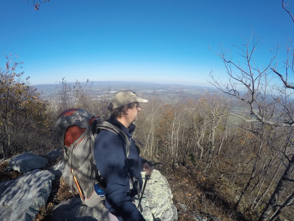 From the Signal Knob parking area, walk north on the Massanutten trail, marked with orange blazes in the shape of a lower-case “i” – a tall bar with a small square above. The trail starts gently ascending a creek valley before turning to climb along the western ridge with occasional views of its eastern counterpart across Fort Valley. Though it’s a small range, you’ll be amazed at how quickly you feel immersed in the mountains here. On my particular trip, I spotted a black bear on the slope below me during this first climb, barely a half-mile into the hike. The climb is gentle but persistent, ultimately gaining about 1400 feet over the next 3.7 miles. A little past the 1.5 mile mark, the trail makes its first switchback at a point where the trees break to provide a view of Buzzard Rocks across the valley on the flanks of the eastern ridge.