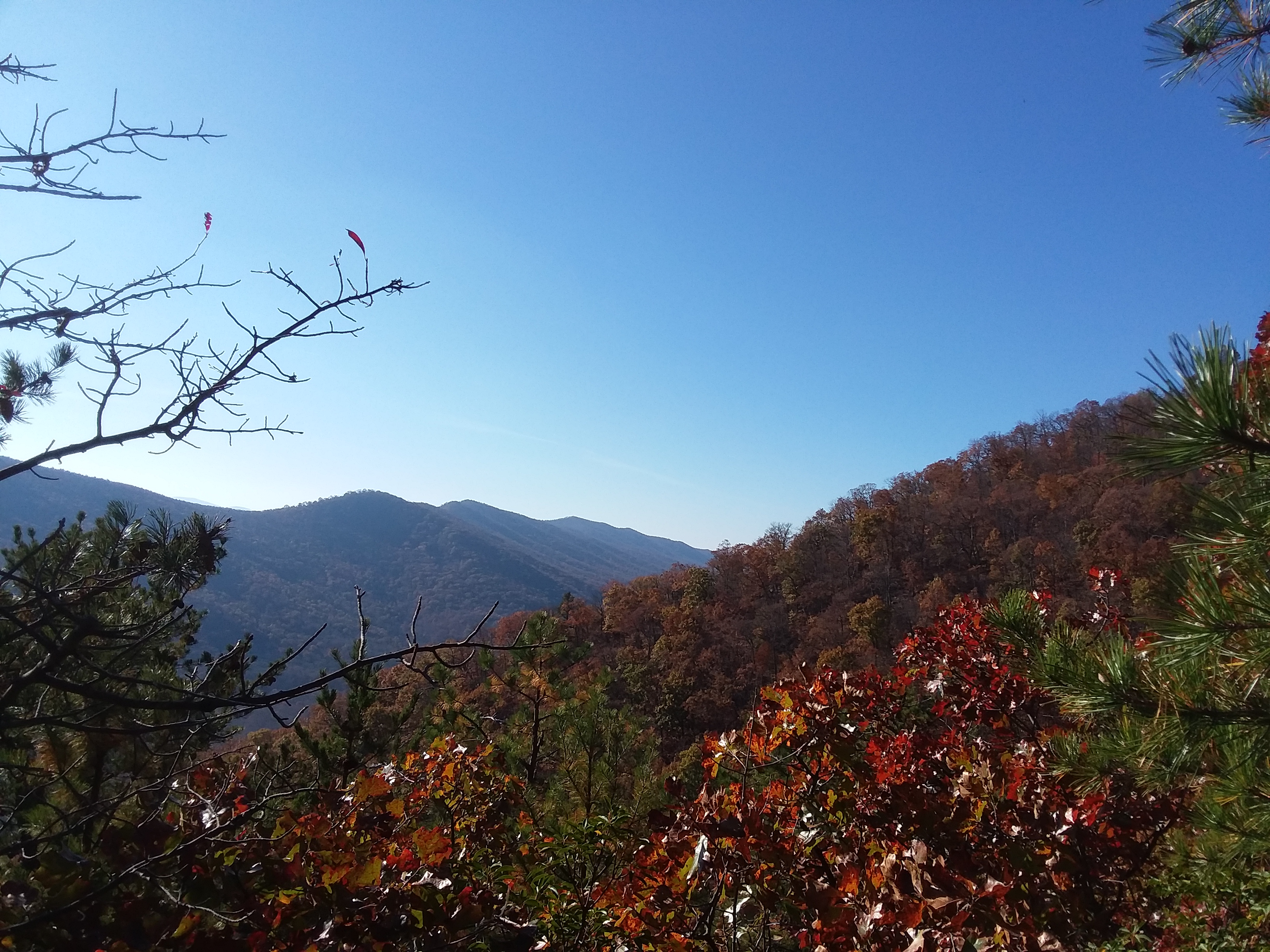 Moving north again, you can see 2393-foot Meneka Peak off to your left as the trail starts to level, the oaks shorten as a testament to the icy winter winds that blow across the ridgetop and keep their growth in check, and occasional laurels start to press in close to the trail. The trail eventually reaches the broad ridge crest, passing several good (dry) campsites as it curves around toward Meneka Peak. A side trail (white blazes) leads south over the peak from mile 3.5. Though not part of this description, the rocky path over Meneka offers a shortcut to this loop which, if backtracking from Signal Knob, reduces the elevation changes required.