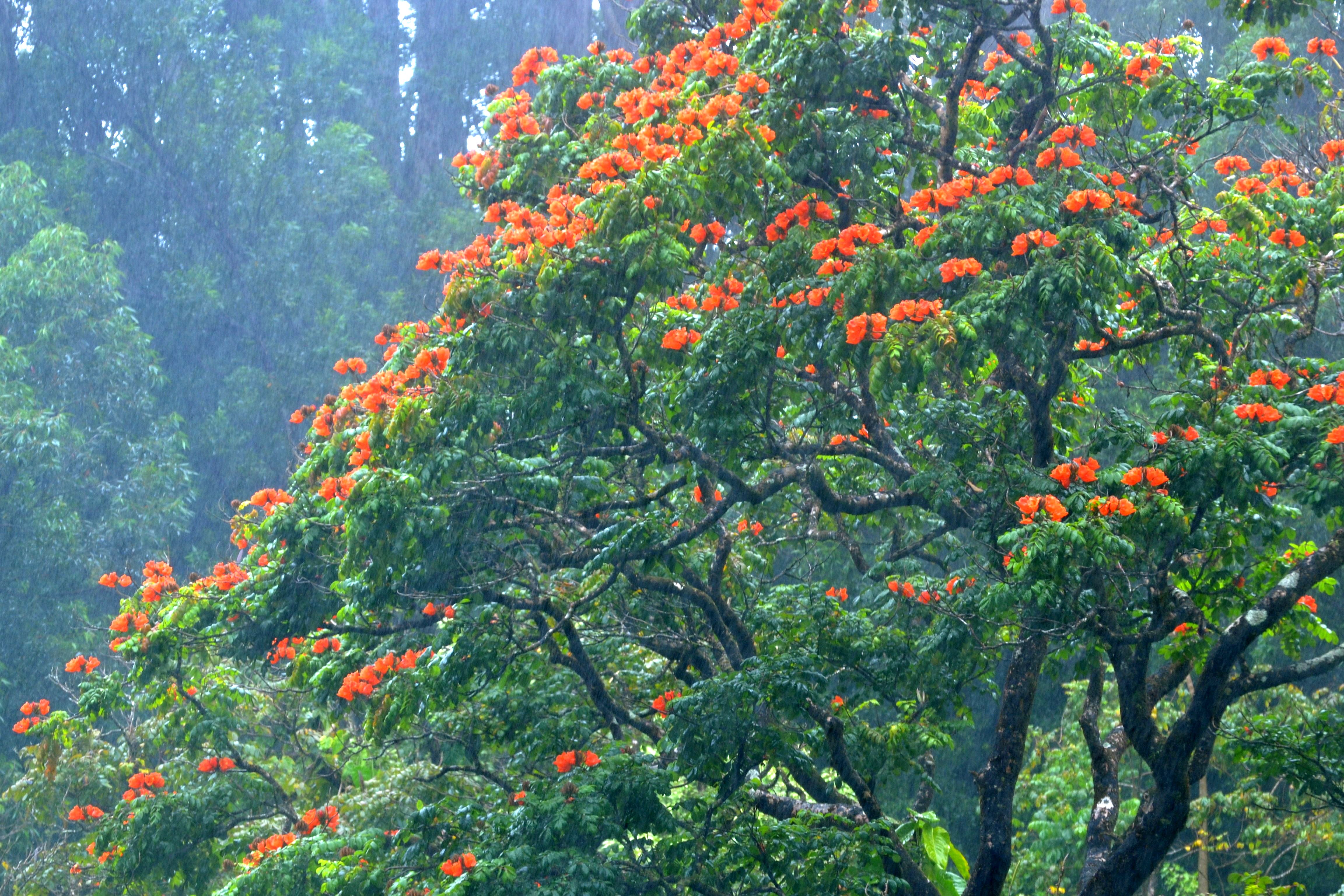 In my post-trip research, trying to figure out what exactly this tree was, I kept running across words like “scourge”, and “plague”. The tree is an African Tulip Tree (Spathodea campanulata), also called flame of the forest, the fountain tree, or fireball. And while it is gorgeous, it’s an invasive tree that is crowding out native plants on Maui and Molokai, in particular. As is the case with many invasive species, the plant’s ability to survive, thrive, and dominate comes from traits that enabled it to be successful in its native habitat. Here in Hawai’i, competitive pressures are not as severe, and the tree’s natural capabilities are rapidly making it the king of a new forest.