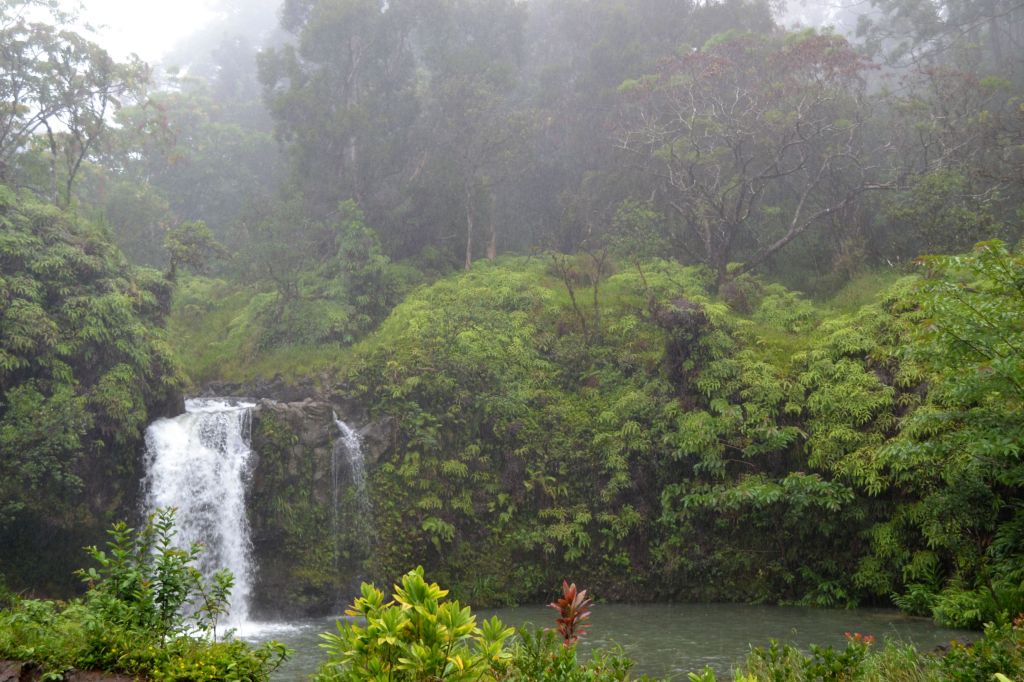 We happened to make the trip in a near-downpour, as rain from still-distant Hurricane Hector was starting to reach Maui, so our exploration of the various falls and other sights was fairly limited. One of the most striking things we kept seeing was a tree, covered with bright orange flowers. It was beautiful, even in the fog and rain – a splash of vibrant color in a green and gray landscape.