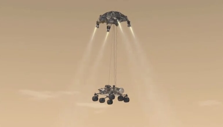 Finally, at about 7,000ft altitude, at 200mph, and about one minute before touchdown, the Skycrane maneuver begins. The Skycrane rides on top of the lander, and is fitted with fuel, rockets, and a guidance system that take the lander to its final touchdown. The backshell, including the parachute, is jettisoned, and the retro-rockets enable the Skycrane-with-lander to make a powered descent while navigating to the final touchdown zone.