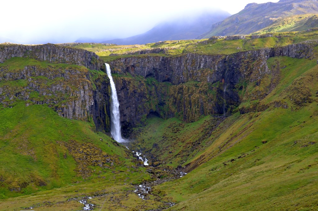 This would prove to be a dominant geologic feature for this trip – Iceland is volcanic. It sits astride the mid-Atlantic rift where the North American and European plates are pulling apart from each other. Here, the magma that emanates from the resulting crack have piled up above the ocean to form Iceland. It’s STILL happening, but we’ll come back to that. The resulting volcanic mountains, and active volcanoes, are not a huge, alpine range – but at 65 degrees north latitude, just barely south of the Arctic Circle, there is quite a bit of snow, and quite a number of glaciers. In addition, the entire area was under an ice sheet during the last global Ice Age. The net effect of all this is, multiple mountains and ridges of basalt pushing up out of the ocean, glaciers piling up on top, and both current and past glaciers carving steep-walled valleys and fjords, and in many cases carving out sheer cliffs before the Ice Age glaciers receded.