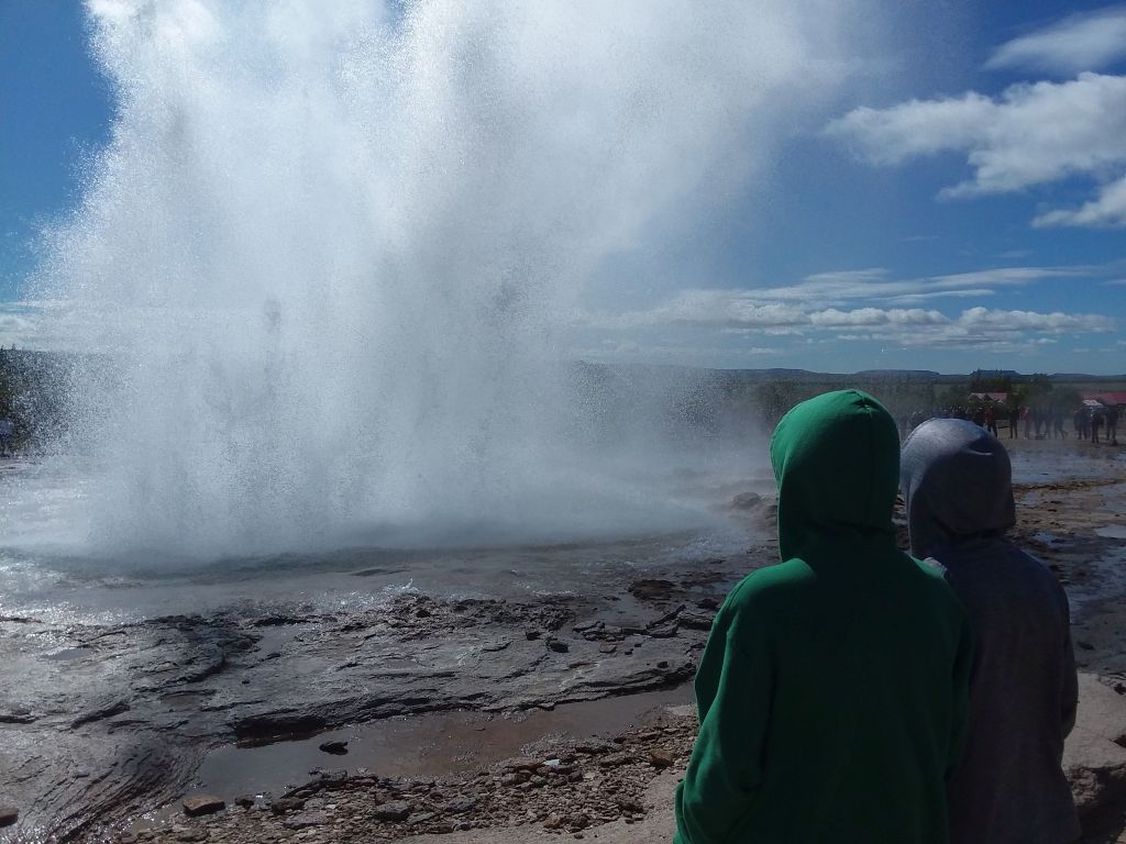 Our next stop took us toward a non-descript plateau without a lot of obvious landmarks to indicate where we were headed until we suddenly arrived. Geysir is the first, the grandfather, the original…uh… geyser. It is the thermal water spout that gave other geysers their name. Today, sadly, Geysir is not very active – but its neighbor, Strokkur, erupts impressively every three to five minutes! Sometimes, a boiling plume fires 70 feet into the air and leaves a cloud of steam in the cool air. Other times, it spits and bubbles just a few feet above the mineral surface that surrounds the pool. Access is controlled by a simple rope fence, seemingly adjusted every day to account for winds and the resulting changes in boiling-water fallout patterns.