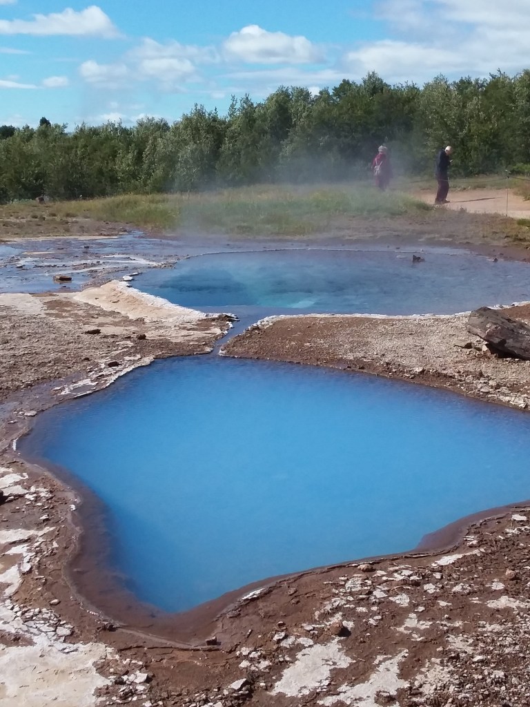 I have not yet made it to Yellowstone, in the US. But this area looks just like what I would expect there (only without the trees, or nearby mountains). Strokkur puts on a reliable geyser show, and multi-color boiling pools and springs litter the nearby landscape with lots of flowstone formations slowly building up from mineral deposits in the water. Even adjacent pools are of different colors, depending on temperature and the various extremophile bacteria that call these pools home. You can wander the area without ever losing sight of the main geyser, Strokkur, and its occasional eruptions and resulting cheers provide a steady backdrop of enthusiasm as you explore.