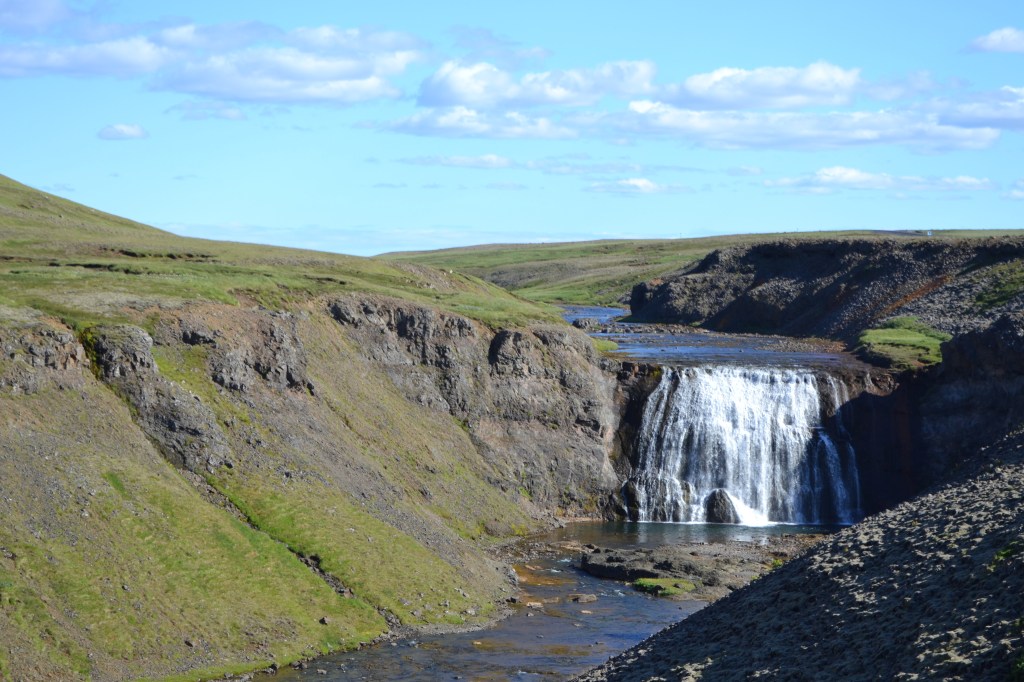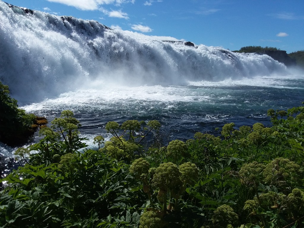Leaving Strokkur, we made our way to a nearby waterfall called Faxi. This was the first area where we had to pay an entrance fee – the observation area and access lie on private property, and so it cost a few dollars to get in. It wasn’t exorbitant, and the area had been set up with a nice elevated viewing platform, campground and picnic area, and then an access to a lower viewpoint right at the foot of the falls. The drop was one wide plunge off a rock shelf, like water flowing over a natural dam. We were initially confused that the place did not contain the usual “foss” in its name, but it turns out that it IS also known as Faxafoss, so all was indeed right with our developing understanding of the language.