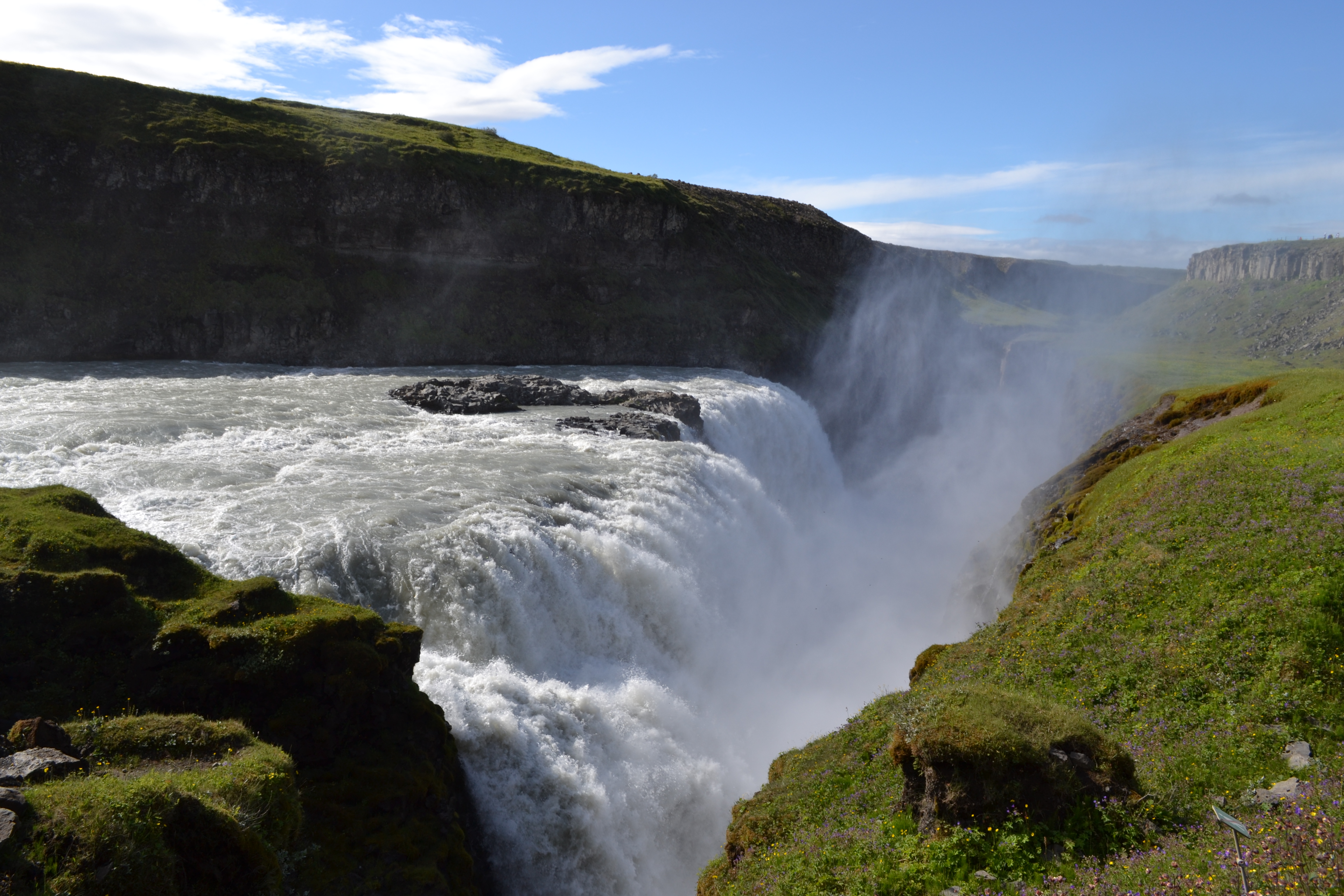 Out early, our first stop was at Gullfoss (Gold Falls), an enormous cascade in a steep-walled canyon that fell off a cliff into a narrow canyon oriented at right angles to the main flow upstream. The scale of the waterfall was impressive, and surprised all of us. It was made even more impressive by the fact that as it fell, the width of the river was cut almost in half, so the volume of water was forced to accelerate through the choking canyon downstream. The falls threw up a huge cloud of mist that formed rainbows in the morning sun, and the roar of the water could be heard from miles away. It was beautiful – and yes, there were buses, and many other people, but we had arrived early and had plenty of room to spread out.