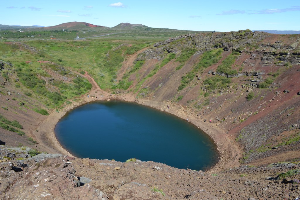 Fully relaxed and rejuvenated, we left the Secret Lagoon to head south again, toward a volcanic crater named Keriđ. Keriđ is much larger and wider than Saxhóll, and has the added beauty of having been filled with a turquoise lake. Here we took the opportunity to walk off the ice cream, and shake out the cobwebs that formed during our relaxing spa treatment, by enjoying a breezy walk around the perimeter of the crater wall. I still wonder how deep the lake is.