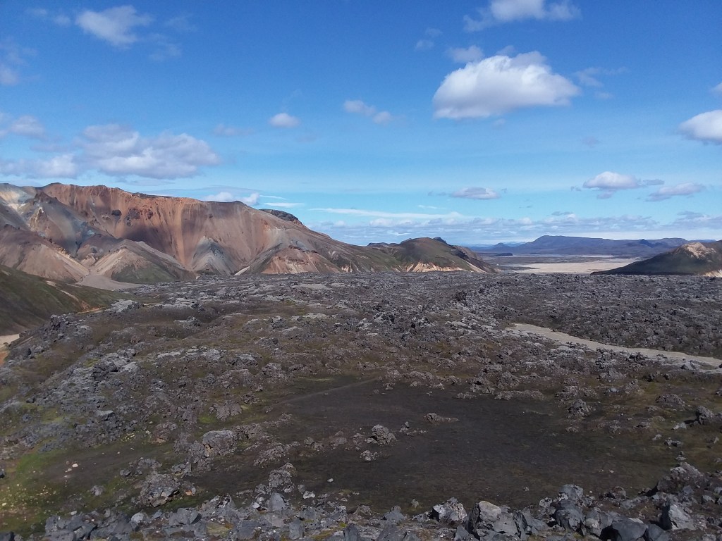 Landmannalaugar is many things – a campground, a way station, the site of a popular hot spring, and the northern terminus of the Laugavegur (roughly, “Hot Spring Route”), a ~35-mile backcountry trail that wound south through the mountains and glaciers into a beautiful valley called Þórsmörk, and then via an optional extension to the southern coast at Skogafoss (a popular waterfall we’ll visit in our NEXT episode).
