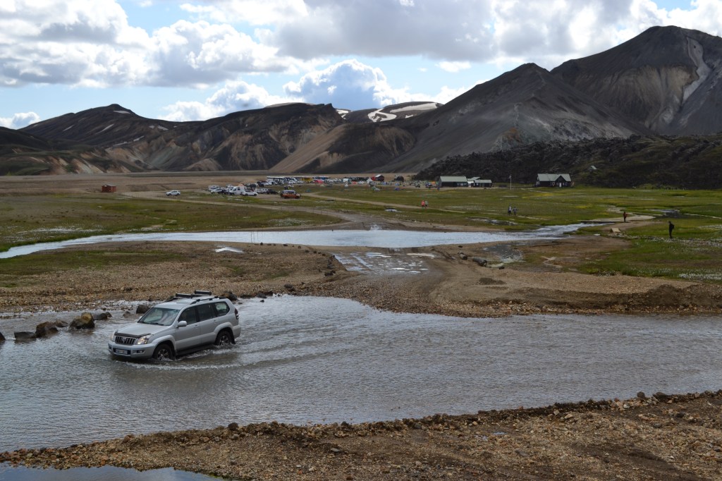 Up against a rugged cliff marking the obvious toe of a lava flow, a small outpost stood in the grass, surrounded by tents and a small parking lot. This was Landmannalaugar (even rougher translation – “Land of the people’s hot springs”), a veritable oasis in what, to this point, had been a bleak land. The road into Landmannalaugar crossed a shallow river through a ford, but we had been warned that even though our rental car might be capable, our insurance certainly wouldn’t cover water damage or help with any recovery efforts should we unintentionally depart the shallowest part of the crossing. Fortunately, there was another parking lot that allowed us to stop short of the crossing, and take a footbridge across instead. From this vantage point, walking toward the ranger station, we got to watch others make the crossing and get a sense that, yes, it was probably a bit deeper than our Duster would have made comfortable.