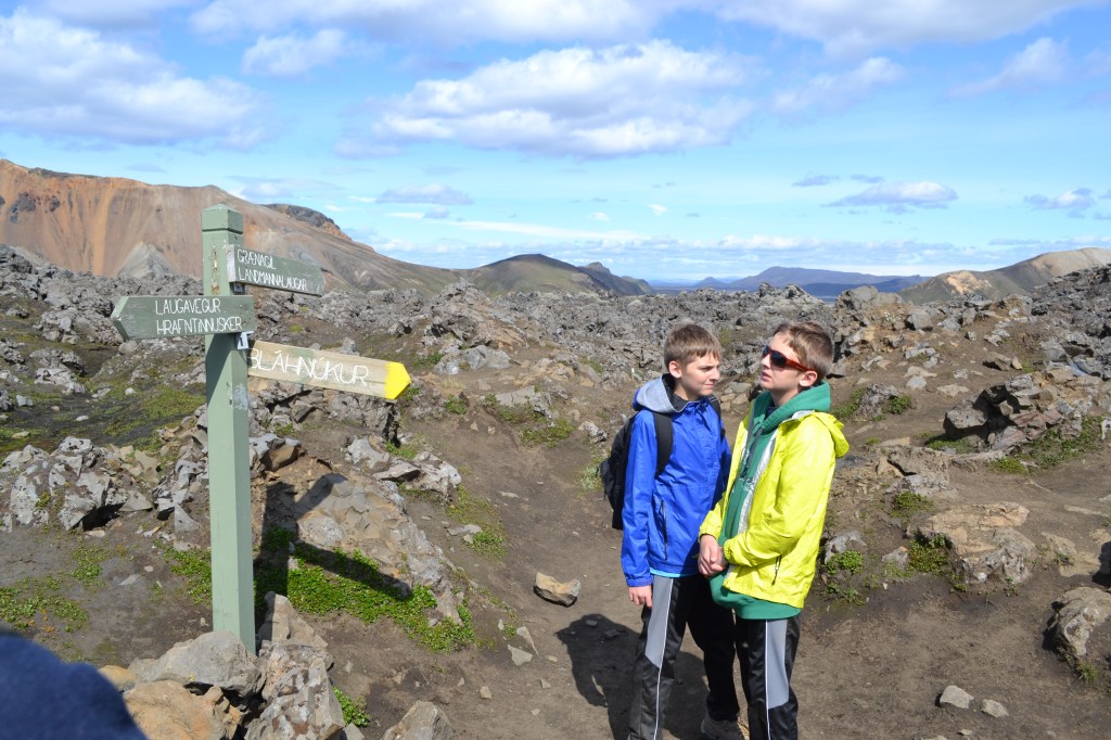 We lingered around base camp long enough to validate our plan – we’d start off on the Laugavegur and climb to the shoulder of a nearby mountain, then turn off on a side trail to descend through Grænagil (the Green Canyon) to create a loop about 4.5 miles in length. Confident of our plan, we hit the trail and passed by the hot springs. The springs themselves were tempting, but we kept our distance, knowing that these particular pools were known for au natural bathing – or at least it wasn’t frowned upon here – and we weren’t ready to give the boys that kind of European education.