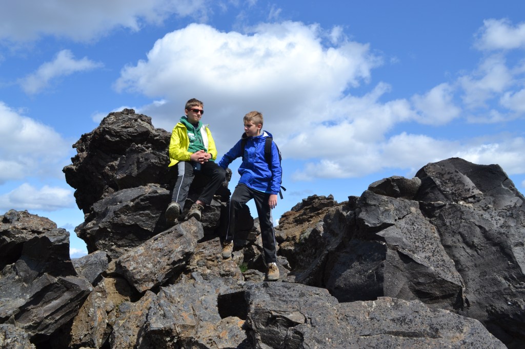 From here, our path led through the chaos of the lava field. From above, no path was evident, but as we walked, we realized that it was clearly, though subtly, marked by color-coded wooden posts. Letting the boys get a head-start though, it felt as if they were disappearing into a lava and boulder maze.