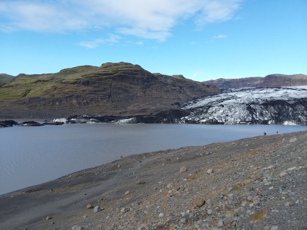 Making our way back west, our next stop was at Solheimajökull (“Sunrise Glacier”), one of the few glaciers accessible from the highway along this stretch of coast. Away from the headlands around Vik, the weather had cleared again, and the sun shone brightly as we walked up to the toe of the glacier (or, as close as safety would allow). The meltwater lake at the glacier’s toe was full of icebergs and kayakers, and an outfitter adjacent to the parking lot offered hiking tours and snowmobile excursions farther up the glacier itself. The folks here informed us that, back when the business was established, 18 years ago, it had been placed adjacent to the glacier’s toe. Now, the glacier was 3/4 mile up the valley. It had receded significantly, and its pace was accelerating. Icelanders have a daily reminder of the effects of climate change.