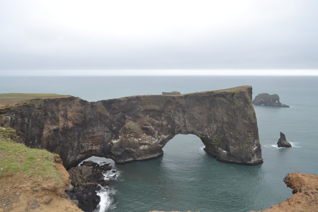 Eventually we did move on, and made our way to the next headland to the west. Here, as at Reynisdrangar, the headland extended into the sea, but rather than leaving sea stacks offshore, the sea had carved a tunnel directly through the cliff. The resulting arch, called Dyrhólaey, is viewable both from the beach and the top of the cliffs, but we found the best views to be from the top of the headland adjacent to the Dyrhólaey Lighthouse. Unfortunately, we arrived just as a wave of wind and rain lashed the hillside, and the temperature dropped suddenly. The wind was furious, but we still marveled at the view of the ocean-carved rock and the surrounding beaches before retreating back to the car.