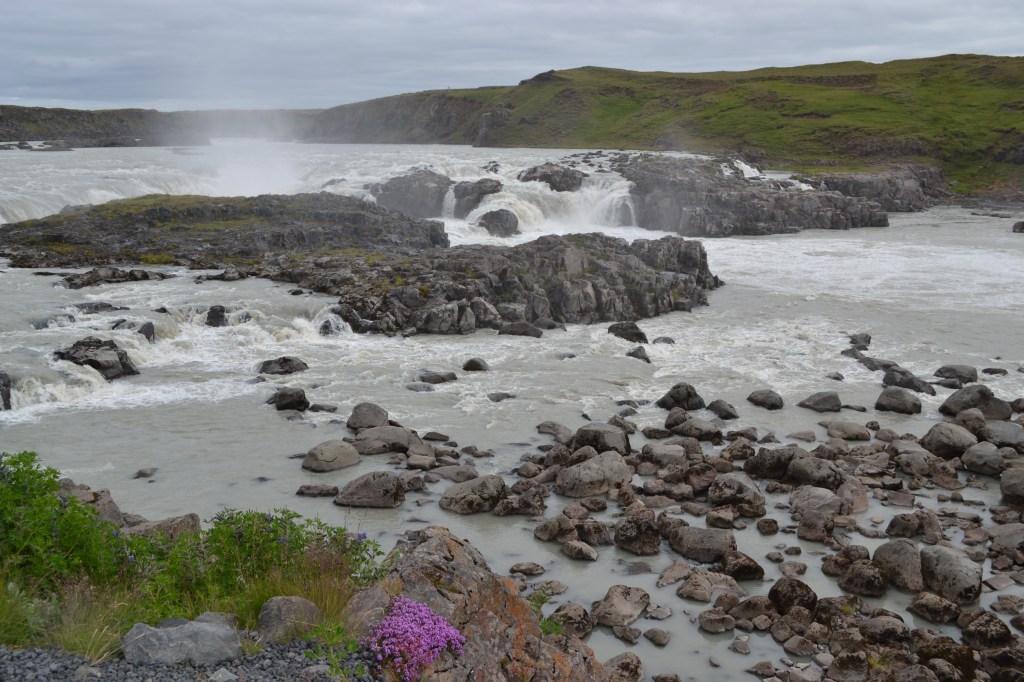 The first part of our journey, between. Reykjavik and the town of Selfoss, was familiar. Beyond this point, we entered new territory, and made our first stop where the highway crossed the Þjórsá River (Thyor-sa), Iceland’s longest. Just downstream of the bridge here, the river falls over a series of ledges to form the roaring Urriđafoss. While not the tallest falls we had seen (or would see), Urriđafoss holds the distinction of being the largest in Iceland, as measured by volume of water.