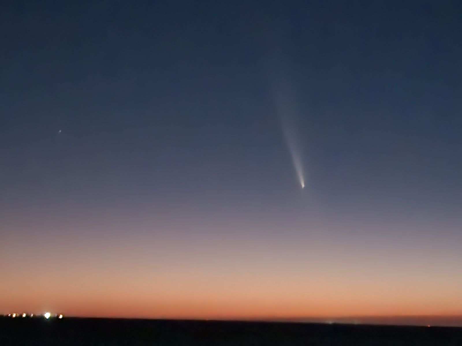 To make up for the poor viewing in the north half of the planet, I offer a three-month-old retrospective, a photo I took of Comet C/2023 A3 Tsuchinshan-ATLAS back on October 11. It’s a fairly low-res shot, made with a smartphone, but still hopefully captures the beauty of the comet. The tail was impressive! This is taken about 45 minutes after sunset, looking out over the Pamlico Sound from Frisco, NC. That’s Venus shining off to the left.