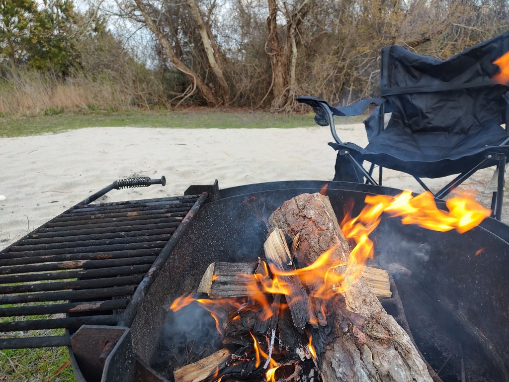 As sunlight started to fade behind the still dense cloud, we got a campfire going and just enjoyed the evening as the temperatures began to fall. It was colder tonight. By bedtime it was just a hair above 40 deg, with wind chills near freezing. We bundled up early and chatted in the trailer for a while, listening to the waves lapping against the sand in the bay nearby until sleep took us. When I woke up just after 1am, the clouds had gone, and it was at least 5 degrees warmer. The full Pink Moon lit up the April night.