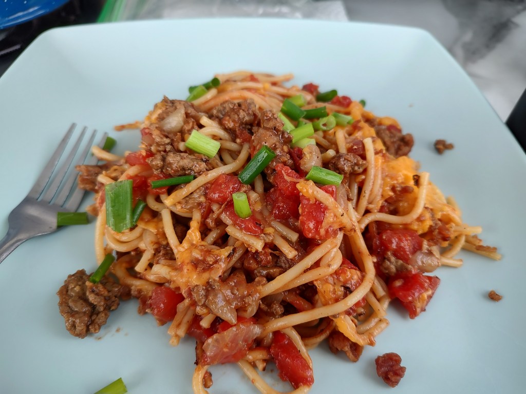 By this time, our stomachs were grumbling again, so we headed back to camp and fired up the stove to make a one pot spaghetti dish with beef, onions, tomatoes, green chiles and lots of flavor. It really hit the spot after a cold day!