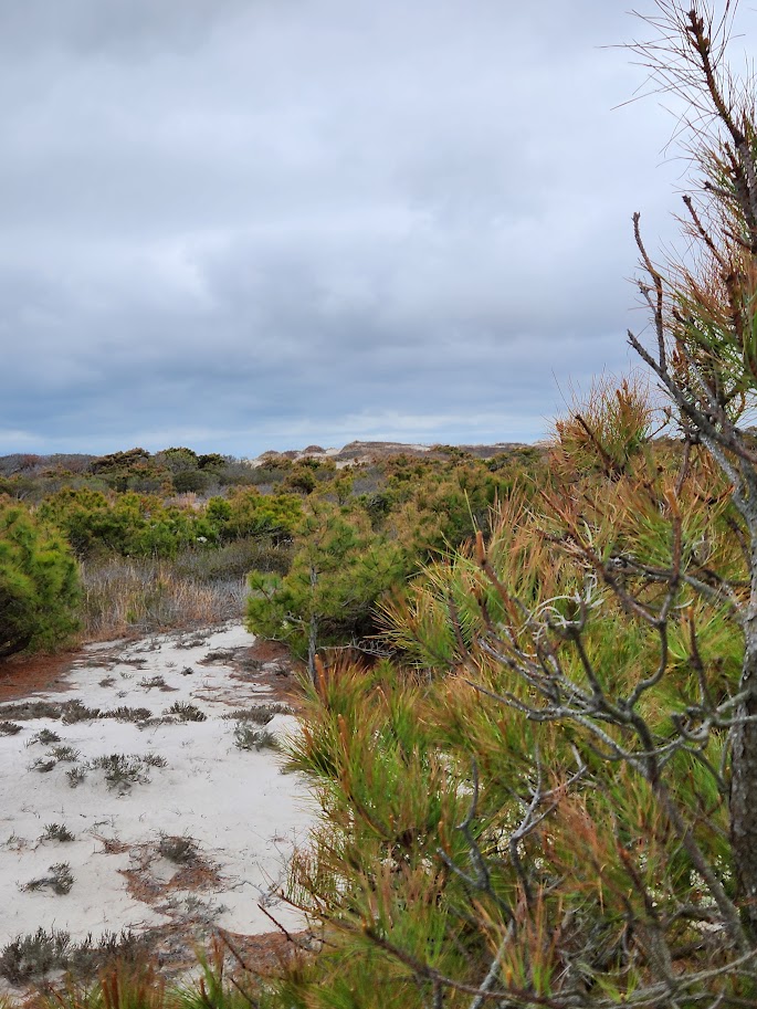We couldn’t hide from the weather forever though. Next stop was a return to the island and a trip down south to where the road ends, and the Life Of The Dunes Trail. I don’t know whether we were getting used to the wind and cold, or whether the dunes themselves were offering enough shelter to make the temps feel more tolerable, but the Dunes trail was nice. The first stretch of it was extremely soft sand that made for difficult walking, but it got easier once the trail split into a lollipop loop.