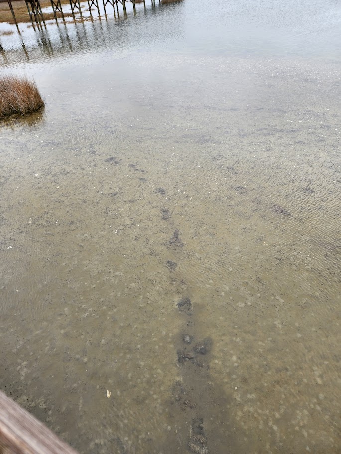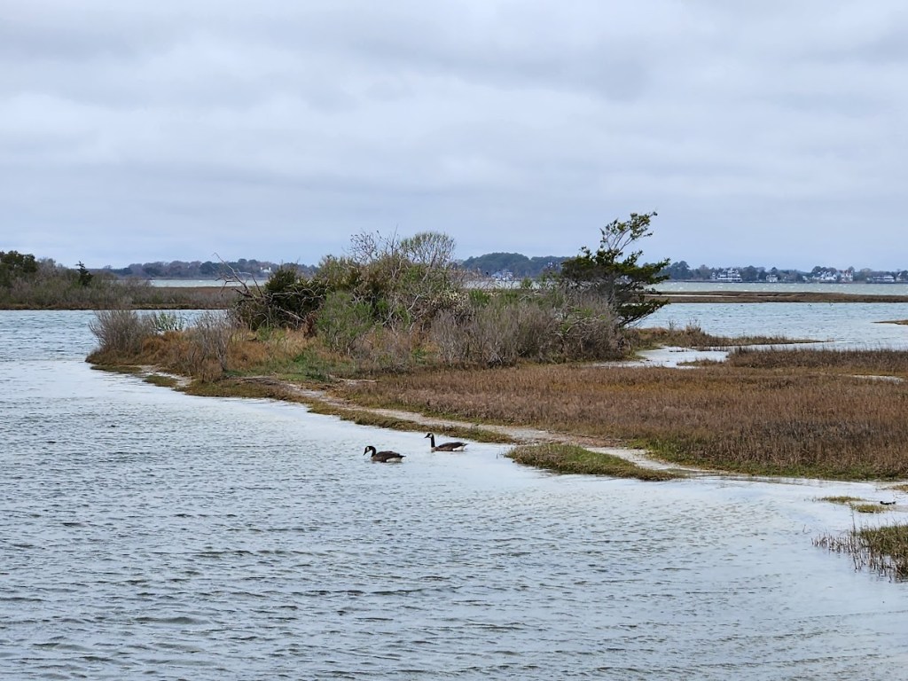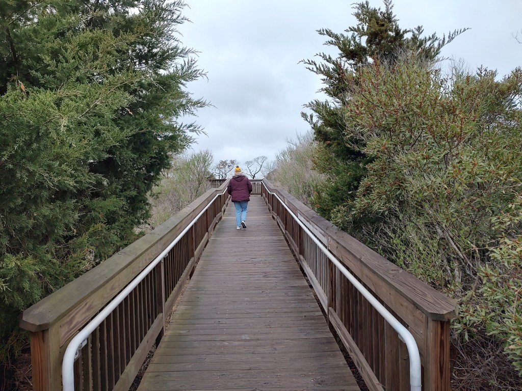 The Life Of The Marsh trail is a very nice, well constructed boardwalk loop that extends about a half mile through the wetlands, and includes a spur to a sandy beach on the shores of Sinepuxent Bay. It’s a great place to view wildlife, and even on a dreary day like this one we encountered a professional photographer with a long lens looking for birds. They were plentiful – greater yellowlegs wading in the shallows, two little blue herons in the grass, two snowy egrets, a gaggle of gulls on a nearby sandbar, red-winged blackbirds, mockingbirds, cardinals and other songbirds were all enjoying the marsh and surrounding low trees.