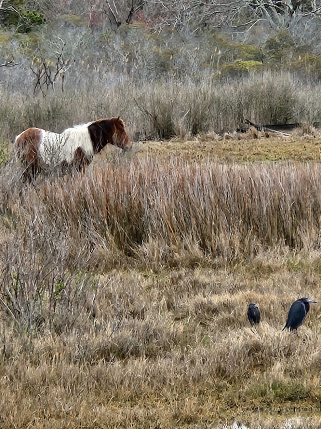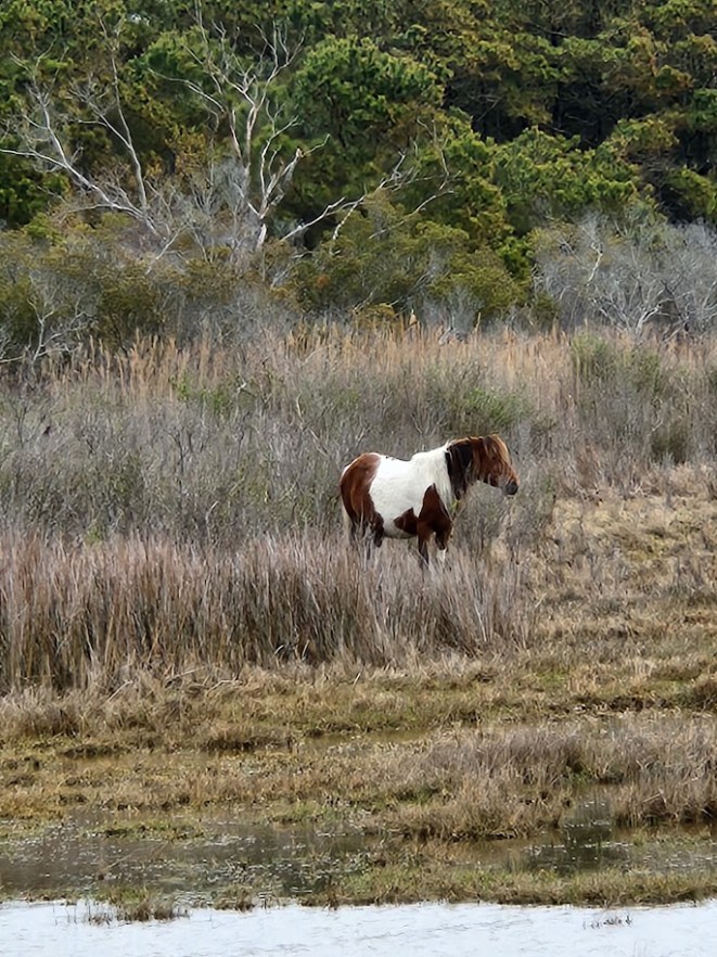 Now, the Old Ferry is one of many excellent places to view local wildlife, and is also an excellent place to launch kayaks – somethings we’ll be sure to do if we can get back here when it’s warmer! In addition to waterfowl – mallards, buffleheads, several snowy egrets and some Canada geese – I saw a brown and white patch moving against the landscape in the marshes to the north. That HAD to be one of Assateague’s famous wild horses.