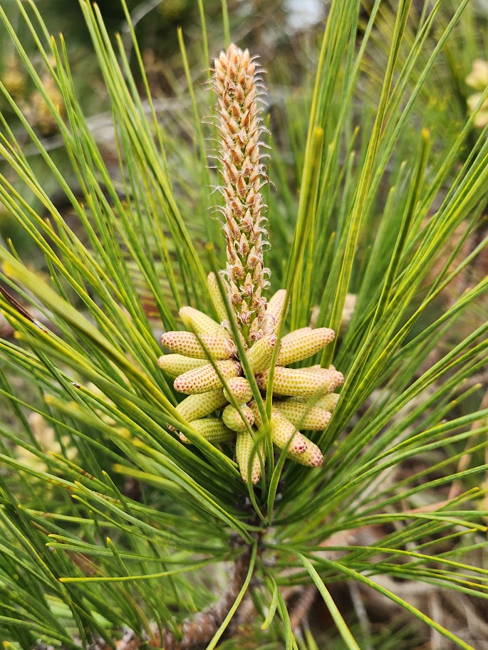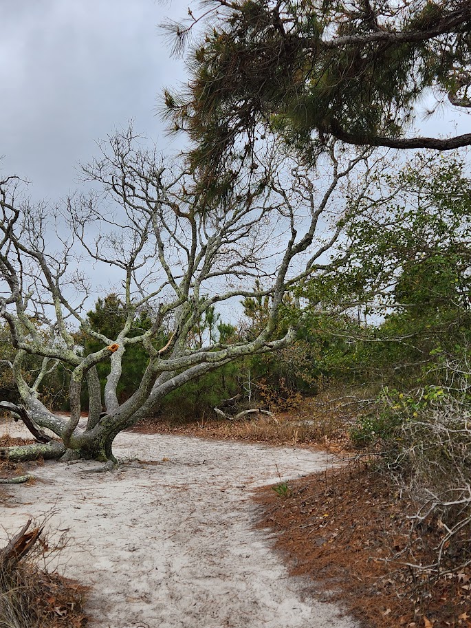 The change in landscape here, from east to west, follows distinct bands of changing environment. Ocean on the east, then beach, high dunes, low dunes, forest, upland marsh, lowland marsh, bay. The Dunes trail traverses along the boundary between forest and low dunes, and then occasionally wanders up to the back of the high dunes. Here, in the second line of dunes, small trees were starting to bud, and live oaks and loblolly pines competed for terrain in which to sink their roots.