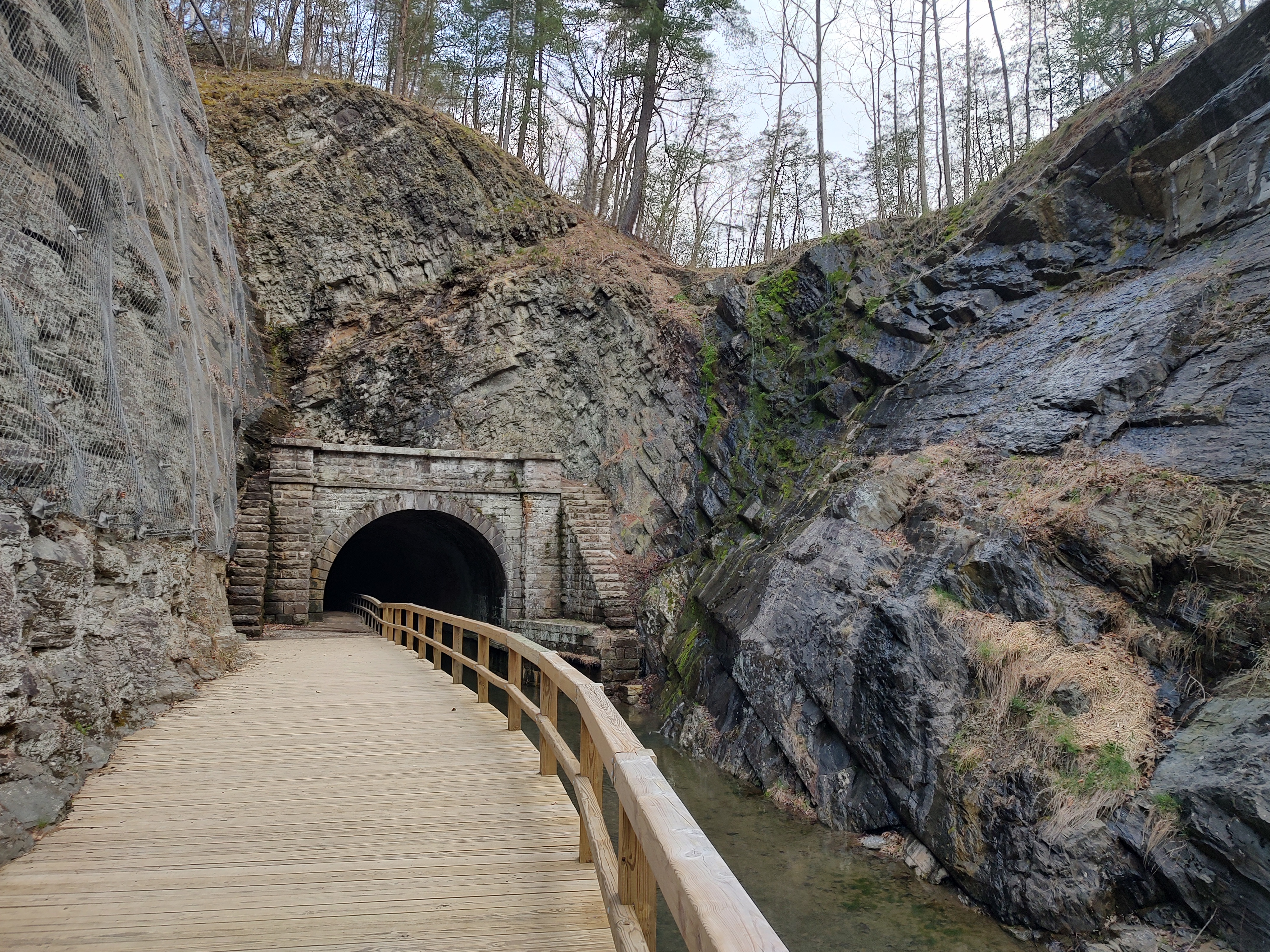 Depending on the route you take, the out and back can be anywhere from about 2.2 miles (to north portal and back), to 4.8 miles (through tunnel one way, all the way to the Potomac, and over Tunnel Hill the other way). Regardless of the route, this is an excellent glimpse into history and a unique hike!