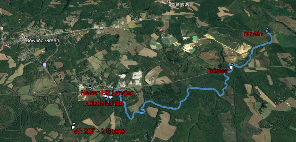So far, I’ve completed two sections, and plan to continue downstream in the near future. Here, I’ll summarize my experiences with the two navigable sections starting as high in the watershed as practical, from VA Rt 605 just west of Bowling Green, VA. (Some might argue that the river can be floated above this, and that may be true at certain water levels, but in my opinion the frequency of down trees and other blockages above 605 make it not worth the effort.)