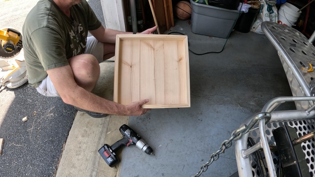 I then used a 1×2 to create a rail around the perimeter of the drawer, using a miter saw to cut each end at 45 degrees so that the result is a nice, pretty finished joint. The left and right rails cross the several boards used to create the drawer bottom, and so by screwing these in first, it helps tie the bottom solidly together before installing the rails at front and back.