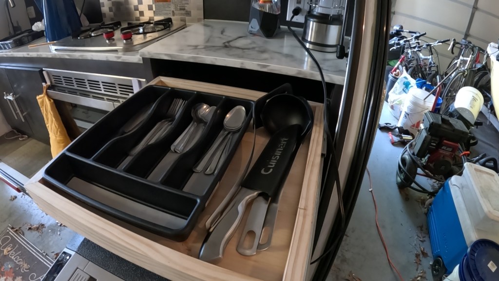 Like most owners of teardrops, we’ve made minor modifications, and the refrigerator is what kicked off the construction. Our used trailer basically had a big opening on the right side of the galley, sized for a fridge or a cooler. In order to make this useful, I was tasked with putting in a large drawer on ball-bearing slides so that the refrigerator could easily slide out for access. Having done that, we decided that we had room above the refrigerator to add another drawer, ostensibly for eating and cooking utensils.