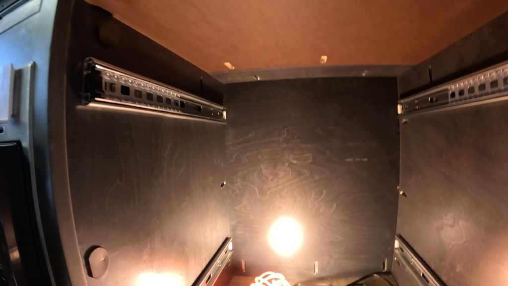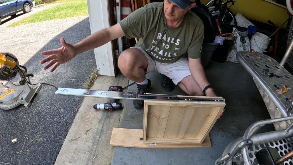 Having completed the wooden part of the drawer, it’s then a simple procedure to add drawer slides to the sides of the drawer, and the inside of the hole in the trailer, and then hoping everything lines up correctly. In order to accomplish this, you have to first make sure the trailer is level, and then use a level to mark rail locations inside the trailer. Note that for the refrigerator (the bottom shelf, in my case), you have to account for the sloping floor on the T@G – it’s very important to make sure the shelf will extend above the clamshell door latch, and the sloping floor is a horrible reference. Using a level is imperative!