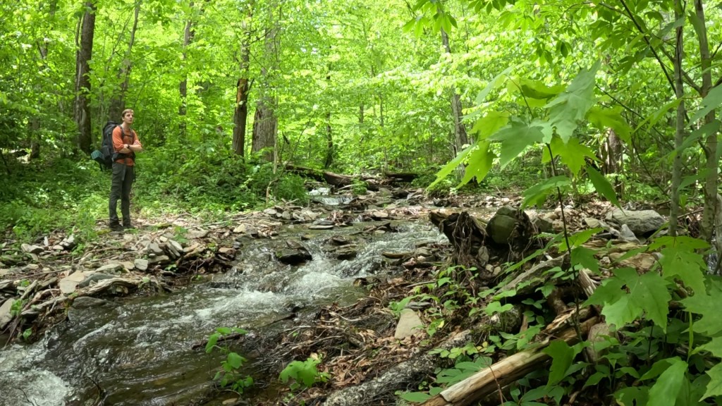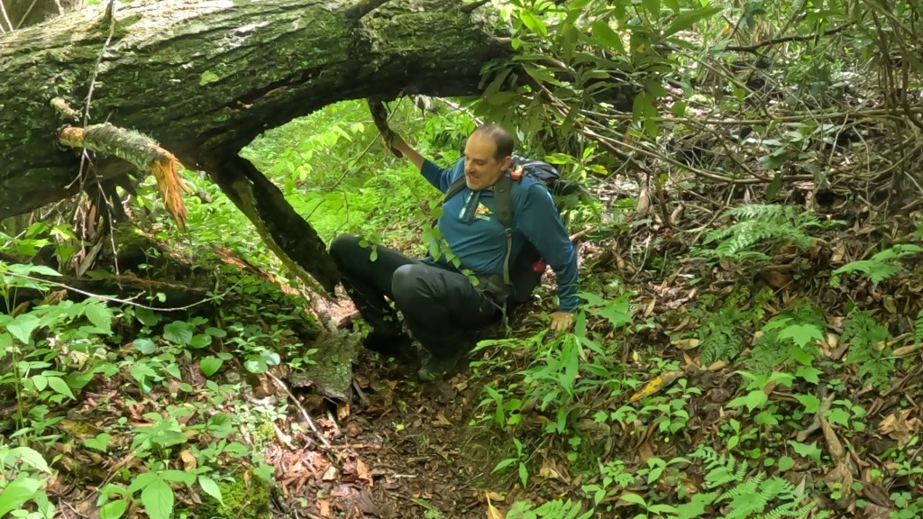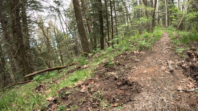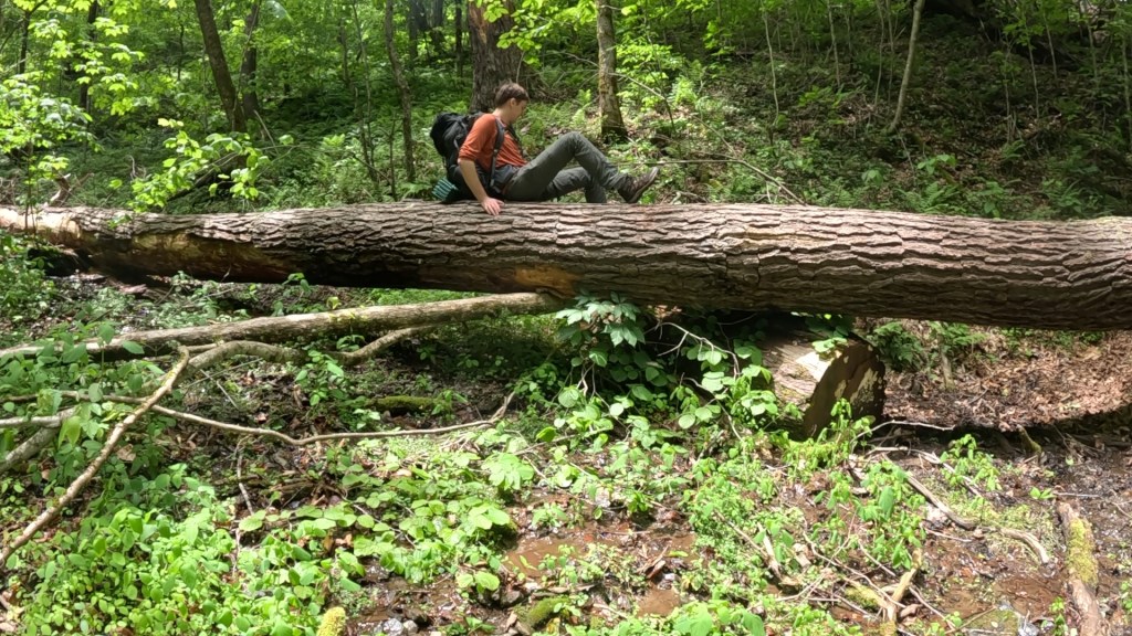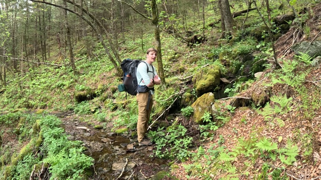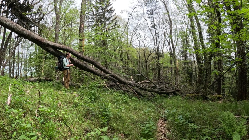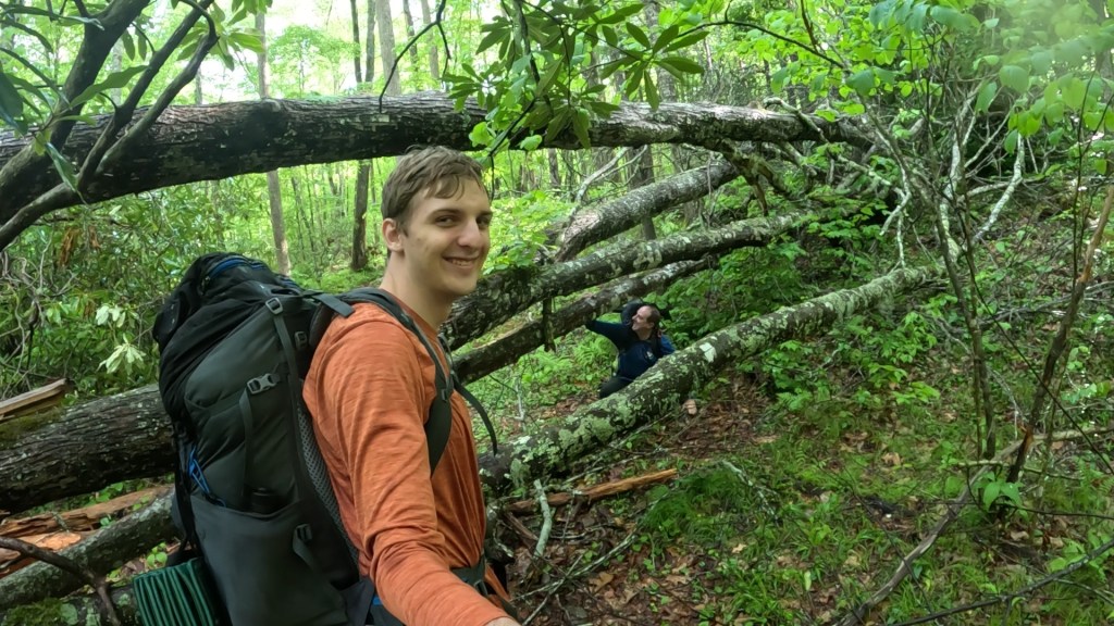 We were starting to feel the effects of the mileage. Not any particular exertion other than repeated footsteps, and calves getting sore from arresting the descent. Blowdowns (fallen trees) were getting more frequent as we got lower too, and each one presented a new puzzle as to how to get by. We noticed a lot of the downed trees had leafed out, meaning they likely didn’t fall during the hurricane, but we’re maybe damaged enough so that a recent storm was able to bring them down. Of course, live branches full of leaves made navigating through our around them even harder. There was nothing to do but press on.