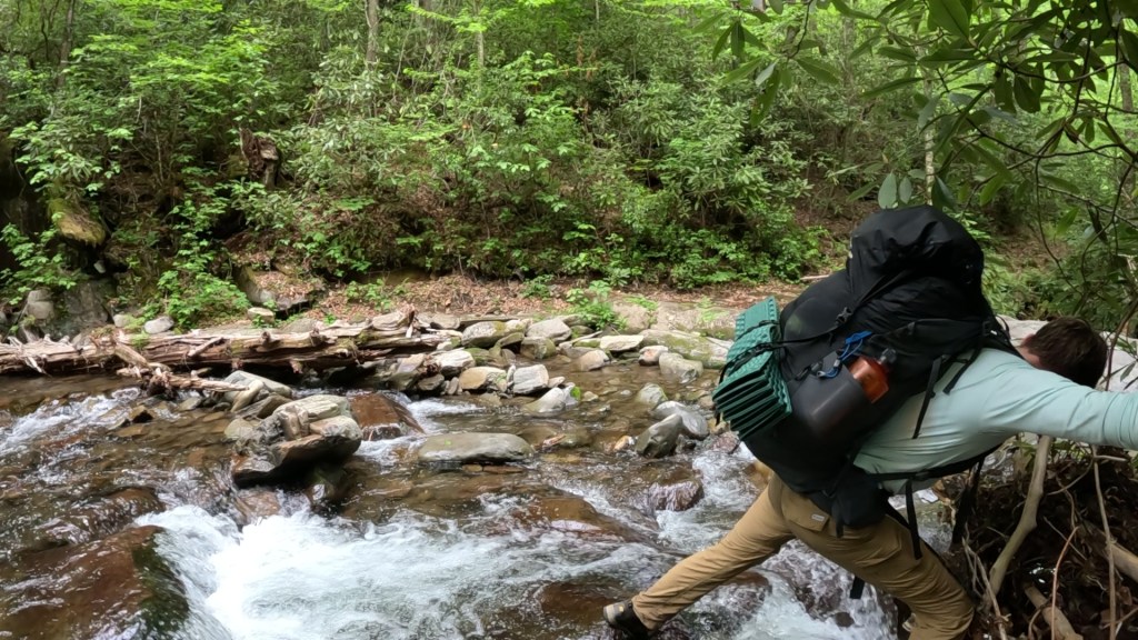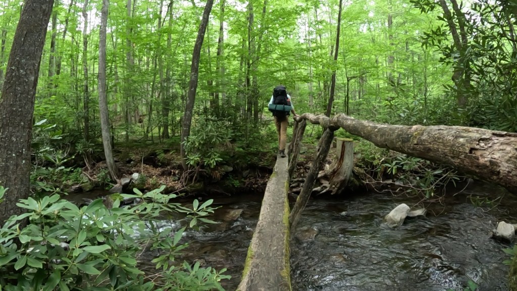 As we made the left turn onto the Balsam Mountain Trail, we saw a grouse up close as it ran/waddled across the trail in true mountain-chicken style. Soon after, we encountered one of only two other hikers we’d see on the trail. (There had been a trio of college-aged guys at the Mt Sterling site, but they left early). Turns out the section we were traversing – Balsam Mountain and Mt. Sterling – are also part of the 290-mile Benton MacKaye Trail, and the guy we met was on THAT journey. Unfortunately for us, that meant he couldn’t share much on the conditions of the creek crossings to come.
