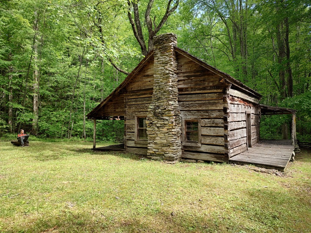 Below the bears, we passed a park service pig trap, and then came around a corner to see an old log cabin! This wasn’t marked on my Gaia map (I’m sure it would have been on a park service map), but we learned it was the Cook Cabin. The roof was sagging, and the front porch had collapsed, but the door was open and we stepped inside to wonder how many people had lived here and for how long.