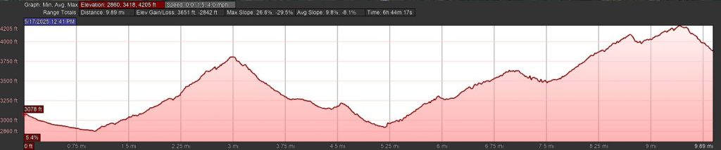 As warned, the rest of our trip included a few more creeks, and many more fallen trees to navigate. Mostly, it was just up. We kept a close eye on our elevation, marking progress against the 4,200 foot high point – and then when we finally reached it, we regretfully had to go back down 400 feet to the car. After all this hiking, the most damage seemed to be to our down-muscles, our calves in particular.