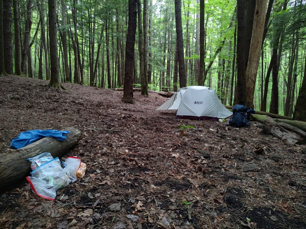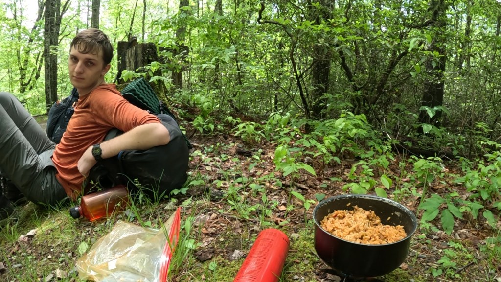 Pretty Hollow camp had a lot of pig rooting damage through the site, but I was able to get my tent up and start working on dinner while my son started working on drying out his boots. By the time dinner was ready, though, and I had made a trip to the creek to refill water bottles, my appetite wasn’t up to the task – probably just because of overall fatigue. We decided to pack up half of dinner (Jambalaya made from a pre-seasoned rice mix with added chicken, chopped up beef stick, and the remainder of onion and pepper from breakfast) in a ziplock for later.