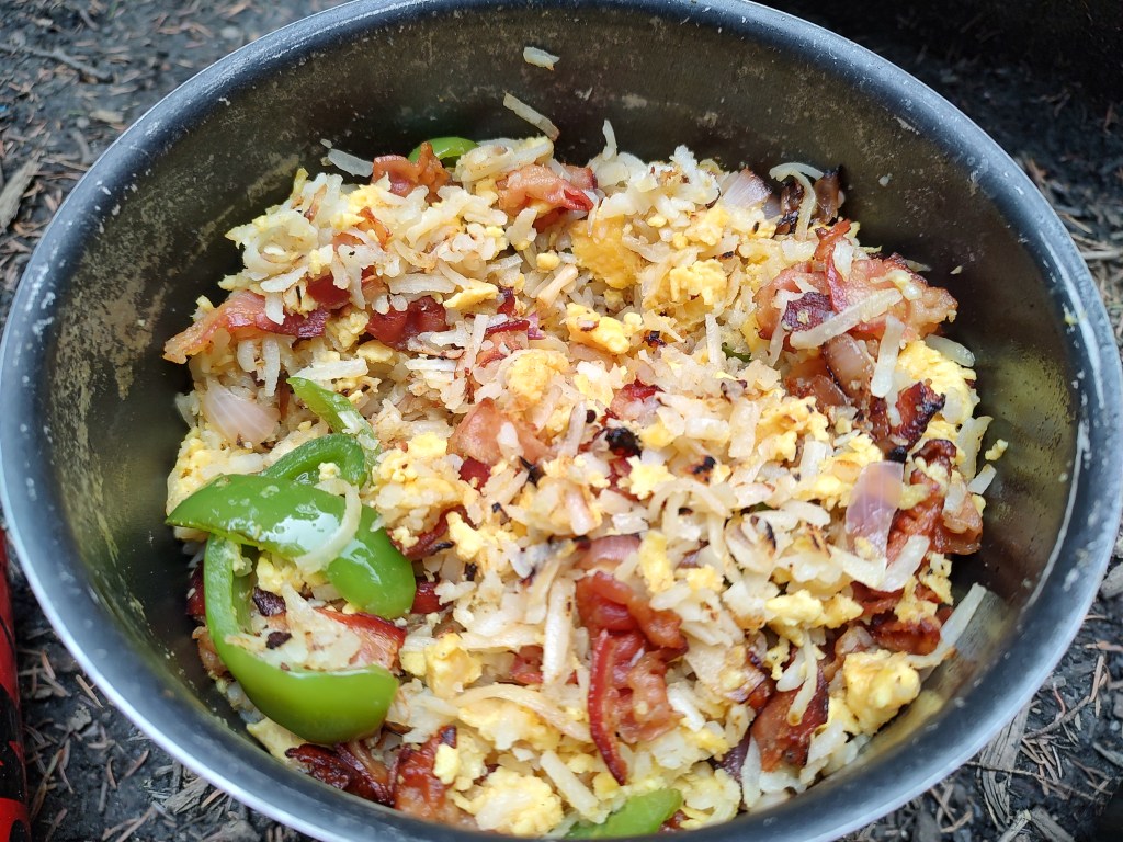 Friday morning dawned cool and clear, and I woke up ready to go. My son begged for a few more minutes in his hammock, so I worked on breakfast while I packed away my tent. We had a hearty scramble made from instant egg crystals (Ova Easy – my first time trying them, and we were both pleasantly surprised), dried/reconstituted hash browns, fresh chopped onion and green pepper, diced pre-cooked bacon, and cheese. Tasty!