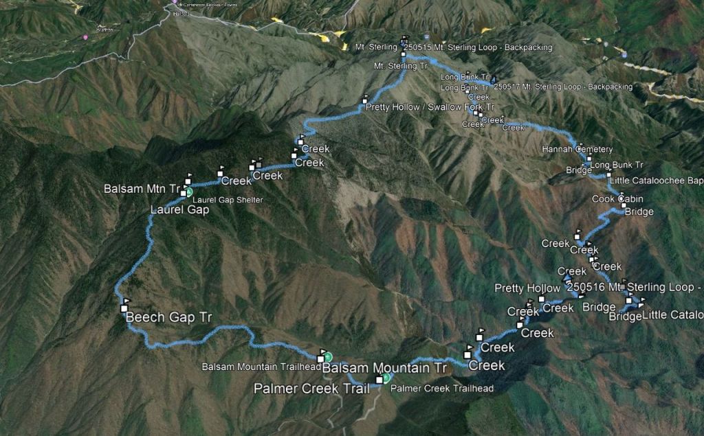 Finding a suitable route was challenging – many trails in the park remain closed or restricted after the damage done by Hurricane Helene in the fall of 2024. The area we selected still warned of several bridges washed out in the creeks in and around Cataloochee Valley, and warnings stated that while the Pretty Hollow backcountry camp (#39) was open, the trail leading to it was washed out and closed to horses. In addition, we were to expect numerous fallen trees across trails throughout the route.