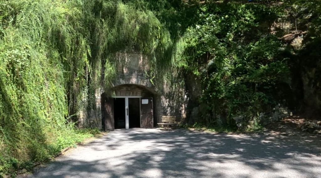 Following a relatively long afternoon at the brewery and a self-guided tour, we made the quick trip over to Indian Echo Caverns. We didn’t know quite what to expect here, but it was a fairly impressive space. Before we could get there though, we had to descend 71 steps down to the shore of Swatara Creek, where the cavern entrance loomed large in a cliff face. Unlike most caverns I’ve visited, the natural opening was HUGE, like walking into a subway. As part of preparing the cavern for tourist visitation, the entrance was walled up and a door installed. The original door, from the late 1920s, still guards the cave opening.