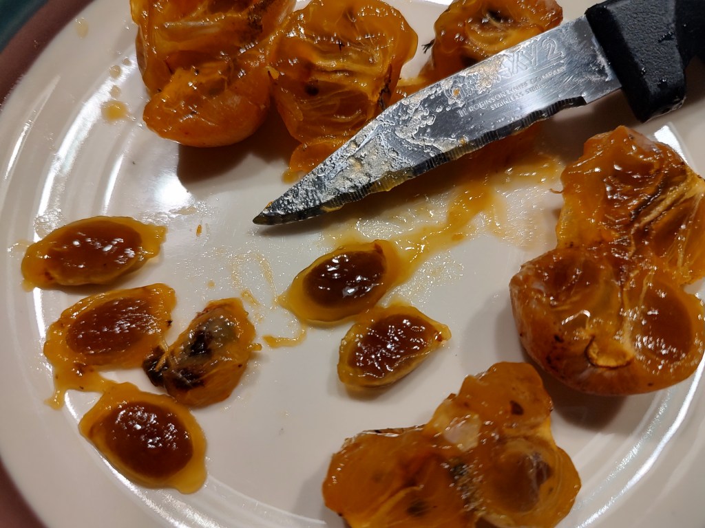 So, it’s the SEEDS that tell us about the winter (of course, I should have known). But the seeds are coated in goopy persimmon-flesh, and a thin skin that tends to hold onto that goop with an impressive tenacity.