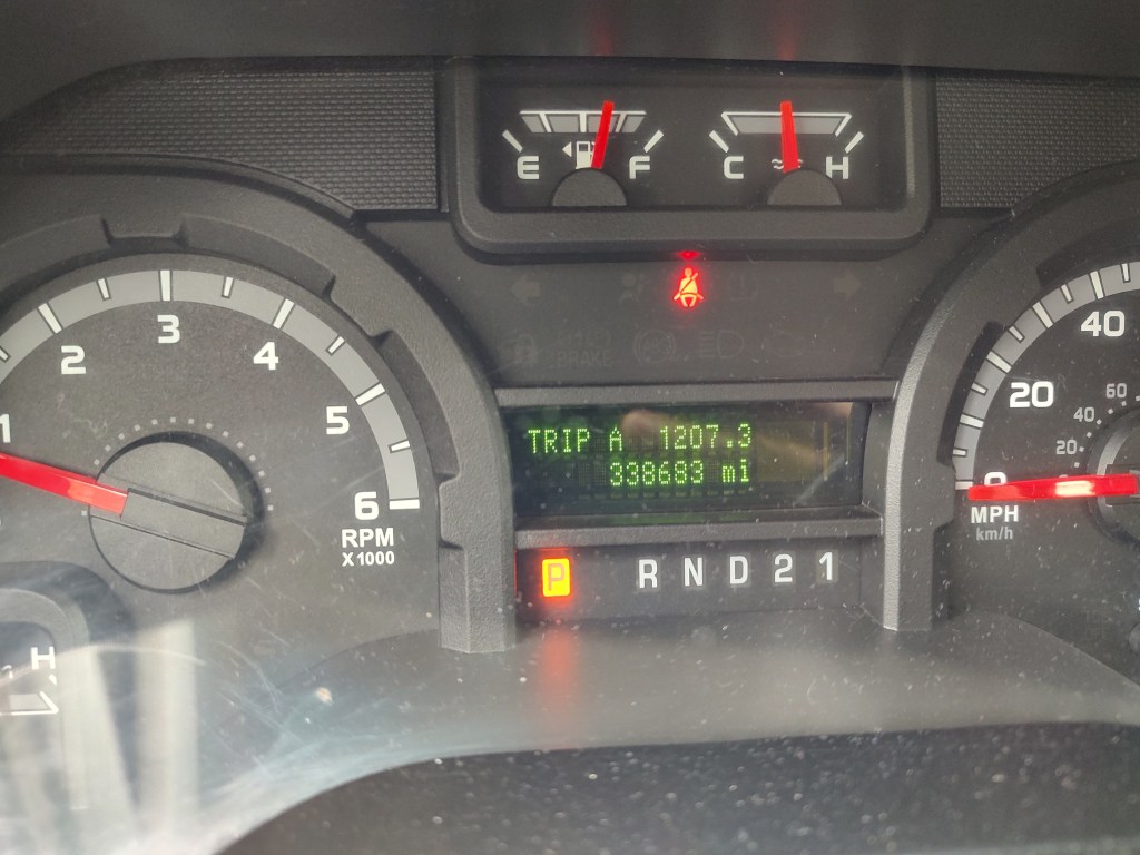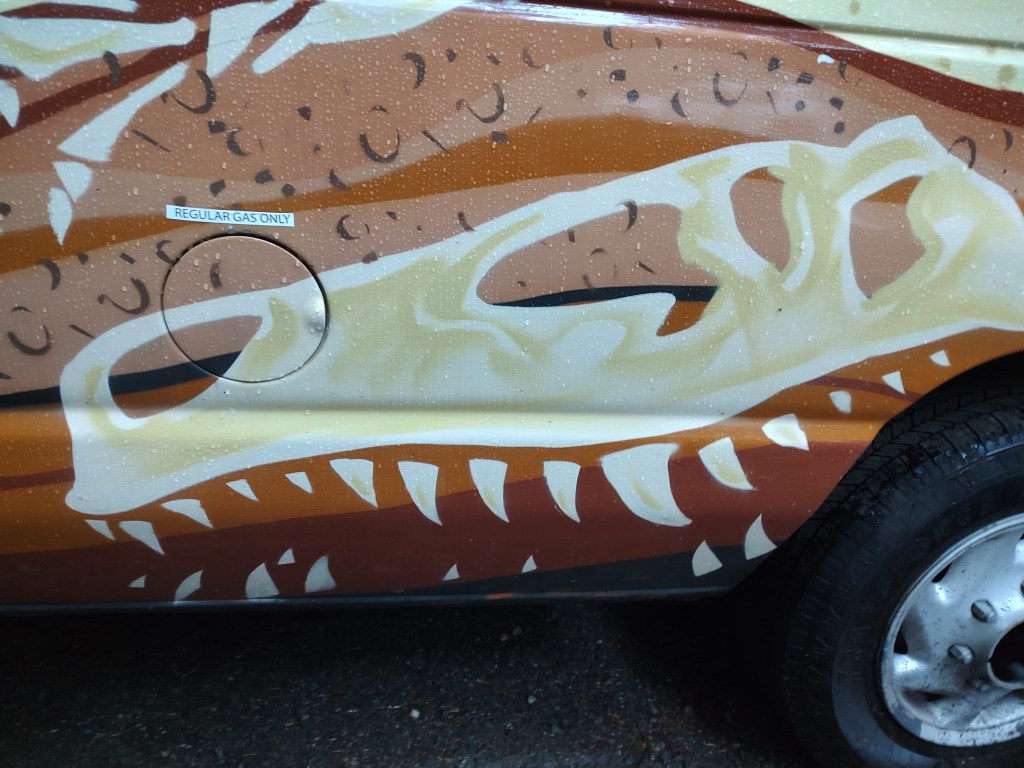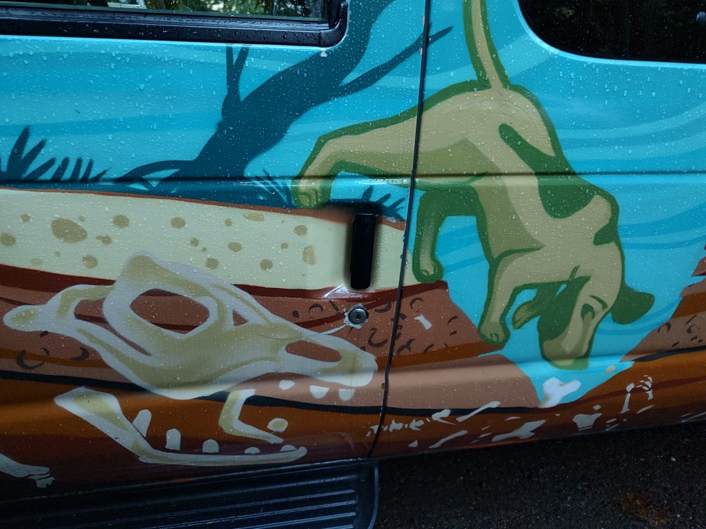 Our van was named “Bones”. It was an older Ford E-Series van with 387-thousand miles on it when we started. Its upper surfaces were sky blue, with maybe a turquoise slant, and the lower half showed a cutaway of the earth, chock full of dinosaur bones. Our van was covered with with the skeletons of several theropod dinosaurs (e.g. T-Rex, Velociraptor/Deinonychus) and an obvious triceratops. On one side, several paleontologists were digging cleanly between the fossils, finding nothing. On the other, a dog was happily burying new bones into the mix. Not only did we never have a problem finding our car in a parking lot, we always got happy smiles and thumbs-up from others wherever we went.